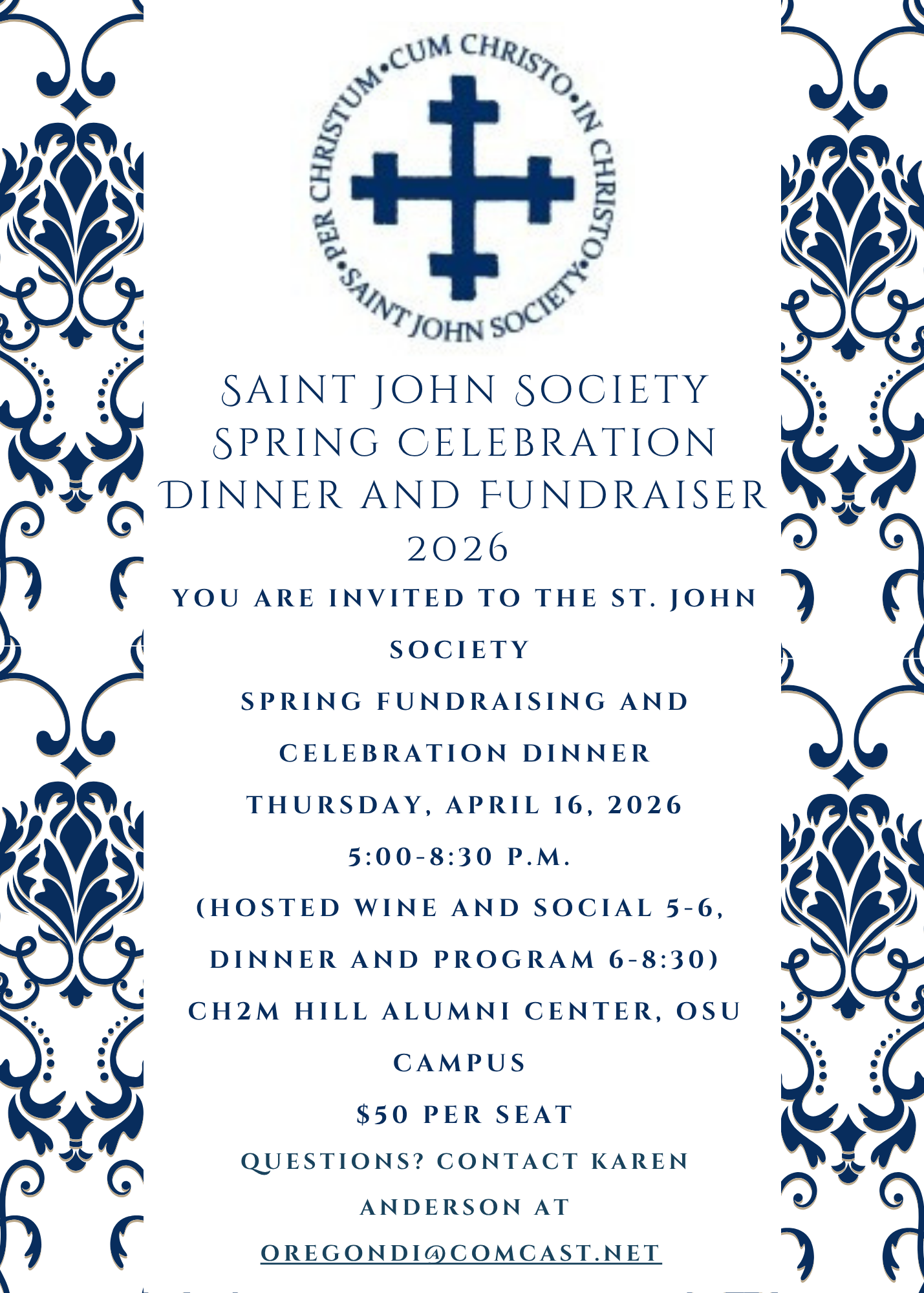 Saint John Society Spring Celebration Dinner and Fundraiser 2026 Thursday, April 16, 2026 5:00 PM 8:30 PM Google Calendar ICS Come Join and Celebrate! Banquet Registration